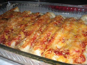 Combine cottage cheese, 1/2 cup shredded cheese, tomato, onions, chili powder, salt, and garlic. Spread about 1/3 cup of the cheese mixture into each tortilla. Roll up tortillas and place seam down in a baking dish. Top with taco sauce and cheese. Bake at 375 uncovered for 15-20 minutes or until cheese is melted.