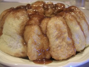 Once dough is thawed enough to cut, cut in half. Grease a bundt pan and place dough in it. Cut butter into slices and place spaced out on top of dough. Sprinkle the rest of ingredients over the top. Cover and let it rise over night. In the morning bake at 350 for 25 minutes. To turn out place serving plate on top of bundt. Grab sides and plate and flip over. Great served with fruit and a tall glass of milk.
