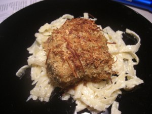 Heat cream and butter in large frying pan with kosher salt, garlic, and basil. (I sprinkle garlic powder in it when I don’t have garlic on hand; and sprinkle basil in to add dimension to its taste). Whisk over medium low heat. Add rue in to thicken it up. Add cooked pasta to the pan and heat until pasta is hot. Serve with breaded chicken.