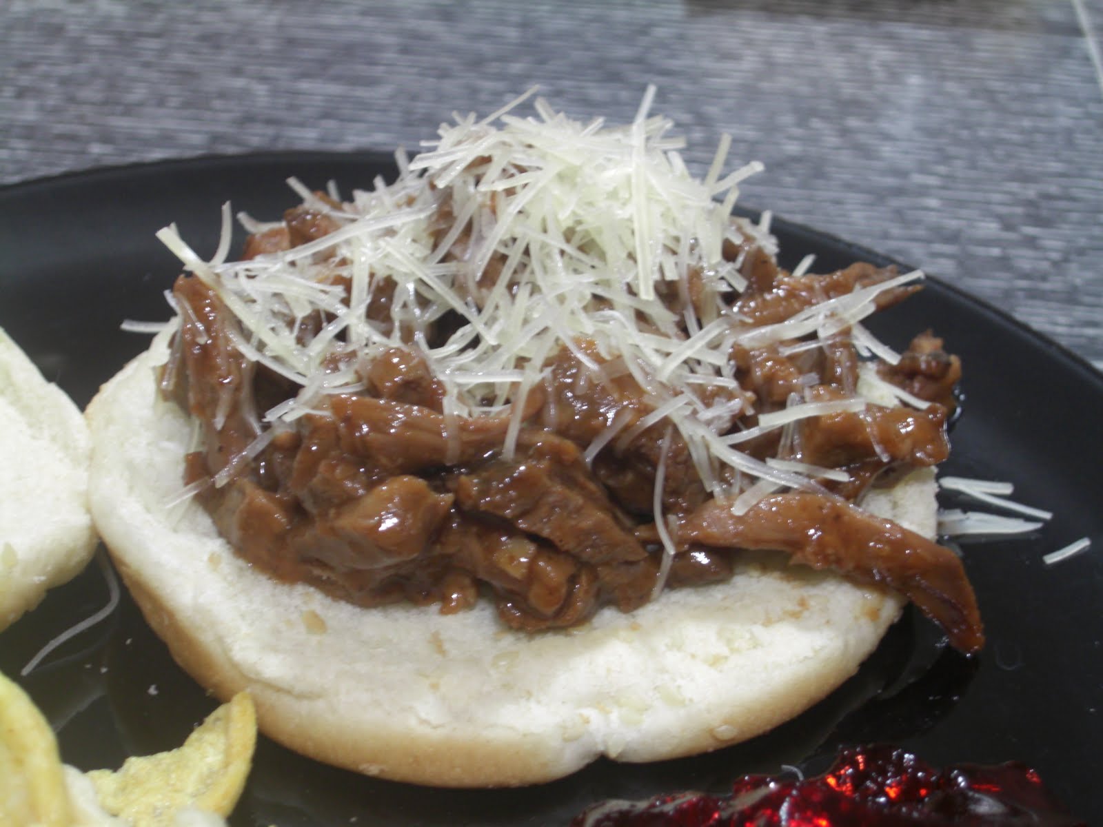 Put roast in crock pot, season with cardamom, salt and pepper. Place mushrooms on top of roast, sprinkle garlic in and place basil leaves on top as garnish (but it will also soak in some flavor into the roast). Crock pot for several hours. I put mine in at 9am and by 1pm it was done**but mine was frozen. Remove meat from crock pot and drain juices and extra stuff in sink. I don’t like eating mushrooms so I drained mine, along with garlic and basil leaves. If you want to eat the mushrooms in the BBQ then by all means keep them. So now you will cut your roast into slices and then cut each slice into slices, about 1/2 inch pieces. Put cut meat back into crock pot. Add BBQ sauce to meat, as much as desired. I used half of a 16 oz bottle. Reheat meat, or I should say heat up the BBQ sauce. Serve warm over hamburger bun. Top with shredded parmesan cheese. Enjoy!