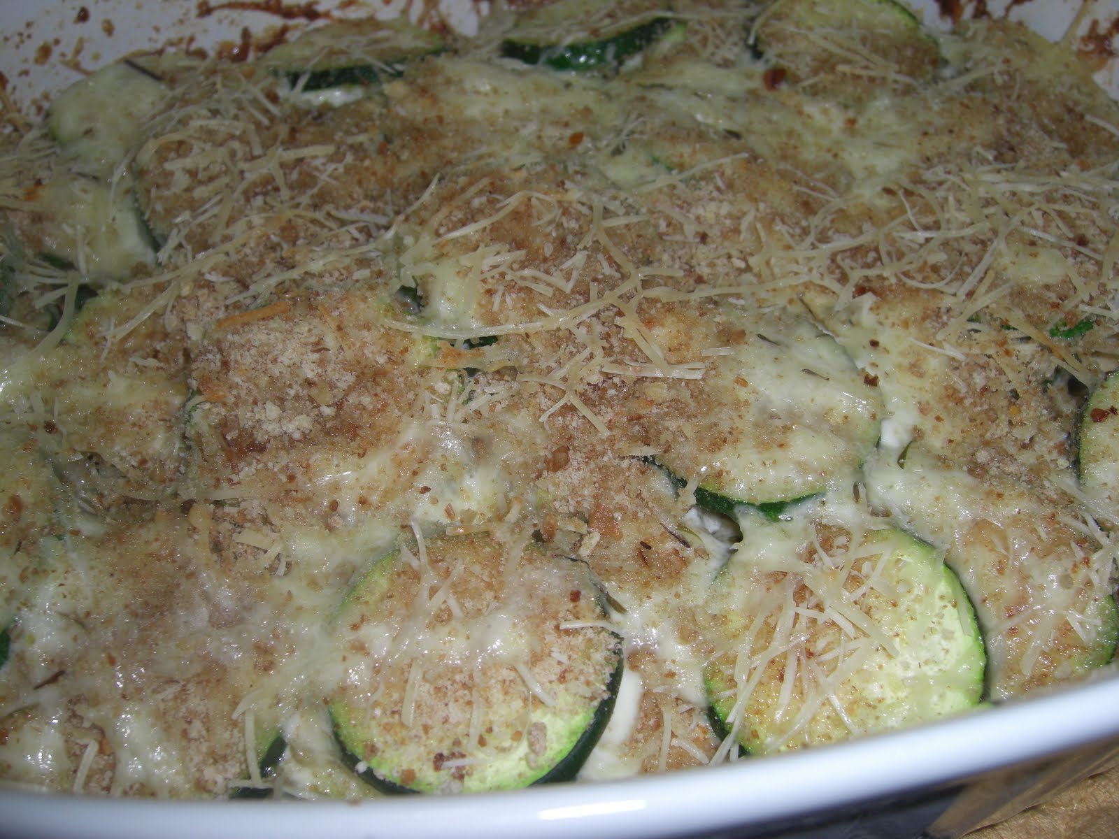 Slice zucchini in 1/8 inch thick rounds. In a buttered baking dish, layer zucchini, salt and pepper, sprinkle of parmesan cheeese, bread crumbs, and drizzle with cream sauce. Repeat layers until the pan is almost full. Finish the top with bread crumbs, parmesan cheese, and drizzle with olive oil.