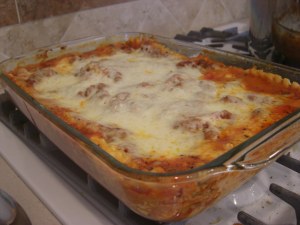 Cook hamburger and onion until done. Add pasta sauce to meat, heat. In a 9X13 pan put a little sauce mixture on bottom. Now you are going to layer with 4 noodles ontop the sauce then add more sauce ontop the noodles. Layer all cottage cheese, then all provolone cheese, then half mozerella cheese. Layer again with noodles, meat sauce, and the rest of mozerella cheese. Bake for 45 minutes uncovered at 350. Let it sit for a couple minutes before serving to let it set up a bit. Serve with CRAZY BREAD.