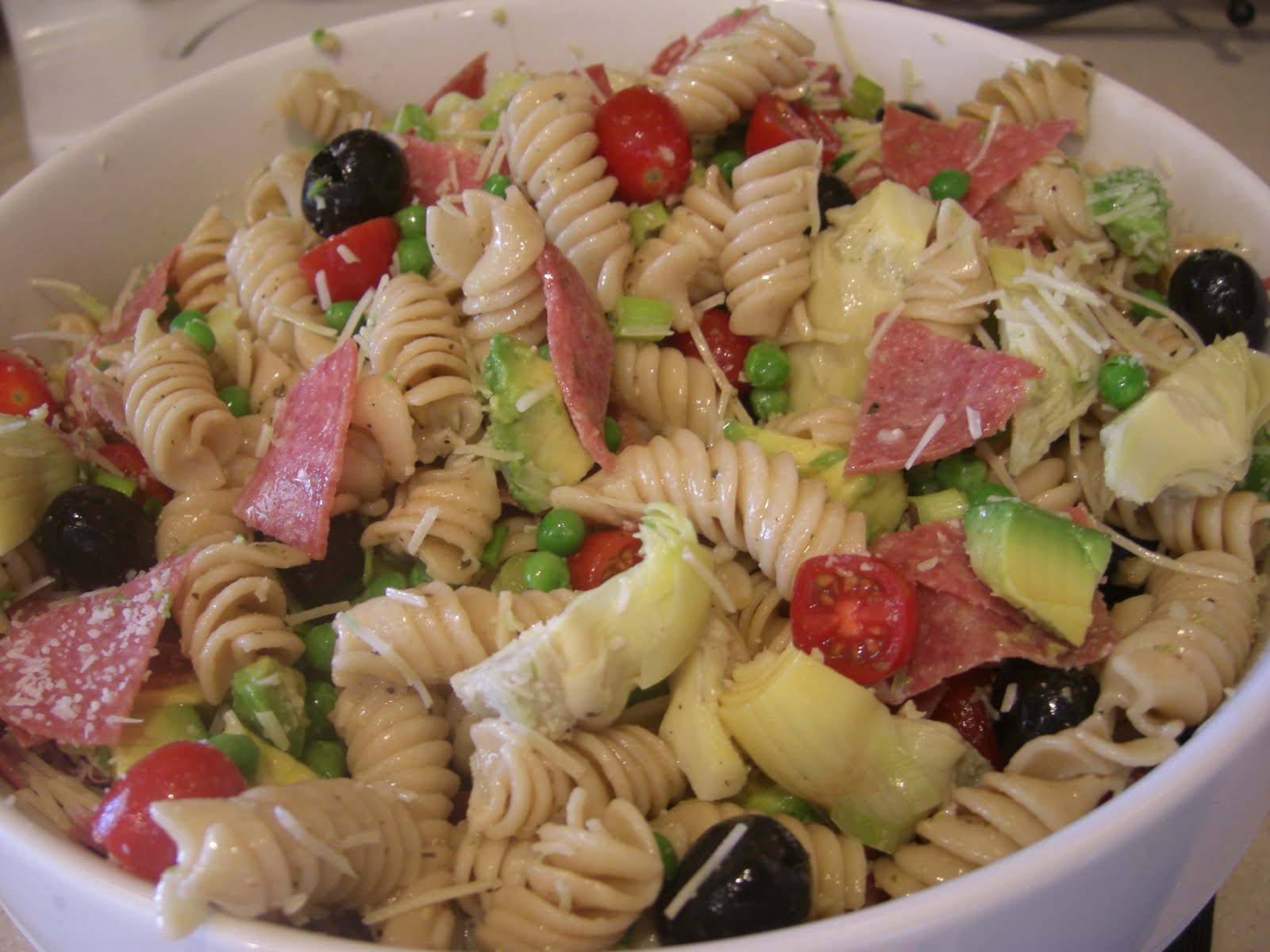 Combine all salad ingredients together in large bowl. Mix dressing in a food processor. Chill for at least 2 hours. Stir into salad and serve.