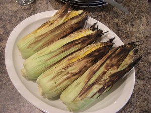Remove some layers of ear so there is only 2 layers of green on the corn. Soak corn in water for 15 minutes. Peel green away from half of corn. On the corn that is showing rub olive oil on it, then sprinkle with salt and pepper. Return green as to cover the corn. Place on grill, turning when green is browned. Remove from grill and enjoy!!