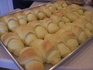 Melt butter. In large bowl add butter to warm milk, salt and sugar. Mix. Add eggs. Mix well. Add yeast. Add flour 1 cup at a time, stirring until you can’t stir anymore. Then knead with hands. Add extra flour if needed. Dough should be sticky. Let it rise for 1 hour or so covered. Take half of dough and roll it out on counter top in a circle (sprinkle flour underneath it to prevent it sticking to counter top). Cut into wedges with pizza cutter, like you would a pie. Pour some melted butter in a cookie sheet-it just depends on how much butter flavor you want. Pick up one slice of dough, swipe it in the butter, then roll from big end to little. Place on cookie sheet. Continue with all wedges of dough. You should be able to fit 3×9 rolls on one cookie sheet. Repeat process with other half of dough. Let them rise covered for 30 minutes (if you don’t have time to let them rise the 2nd time its ok). Bake at 350 degrees for 20 minutes or until golden brown. Serve warm!