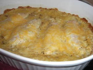 Stir all ingredients together except cheese and chicken in a 11×8 ish shallow baking dish. Top with chicken, sprinkled with cheese. Cover with aluminum foil. Bake at 375 for 50 minutes.