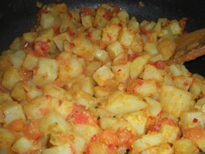 After cooking, cooling, and dicing potatoes (place in a bowl and set aside)heat a large skillet. Add oil and onions and cook until golden brown stirring frequently. Add the chili peppers and tomatoes until liquid is almost gone. Add all the spices and salt. TASTE it and see if you want to add anything! Cook for a minute and then add potatoes until heated. Serve with Grilled Tandoori Chicken
