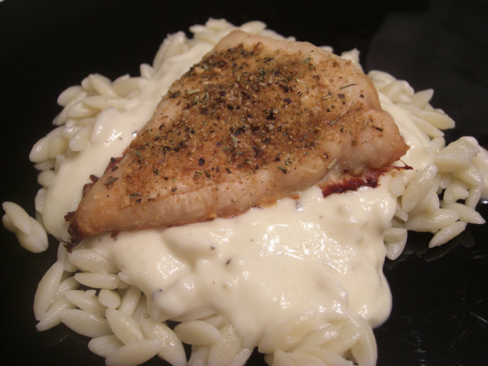 Heat in sauce pan, over medium high, olive oil. Add garlic and stir until tender, it doesn’t take long (or light, light brown. You don’t want to burn the garlic or else the whole dish will taste like burnt garlic). Reduce heat to medium low. Add cream and salt and pepper. Make your Roux*. Whisk in. You may need to adjust amount of Roux: less for thinner sauce, more for thicker sauce. Add lemon juice. Serve over ORZO (any pasta noodle will do) and top with Baked Chicken.