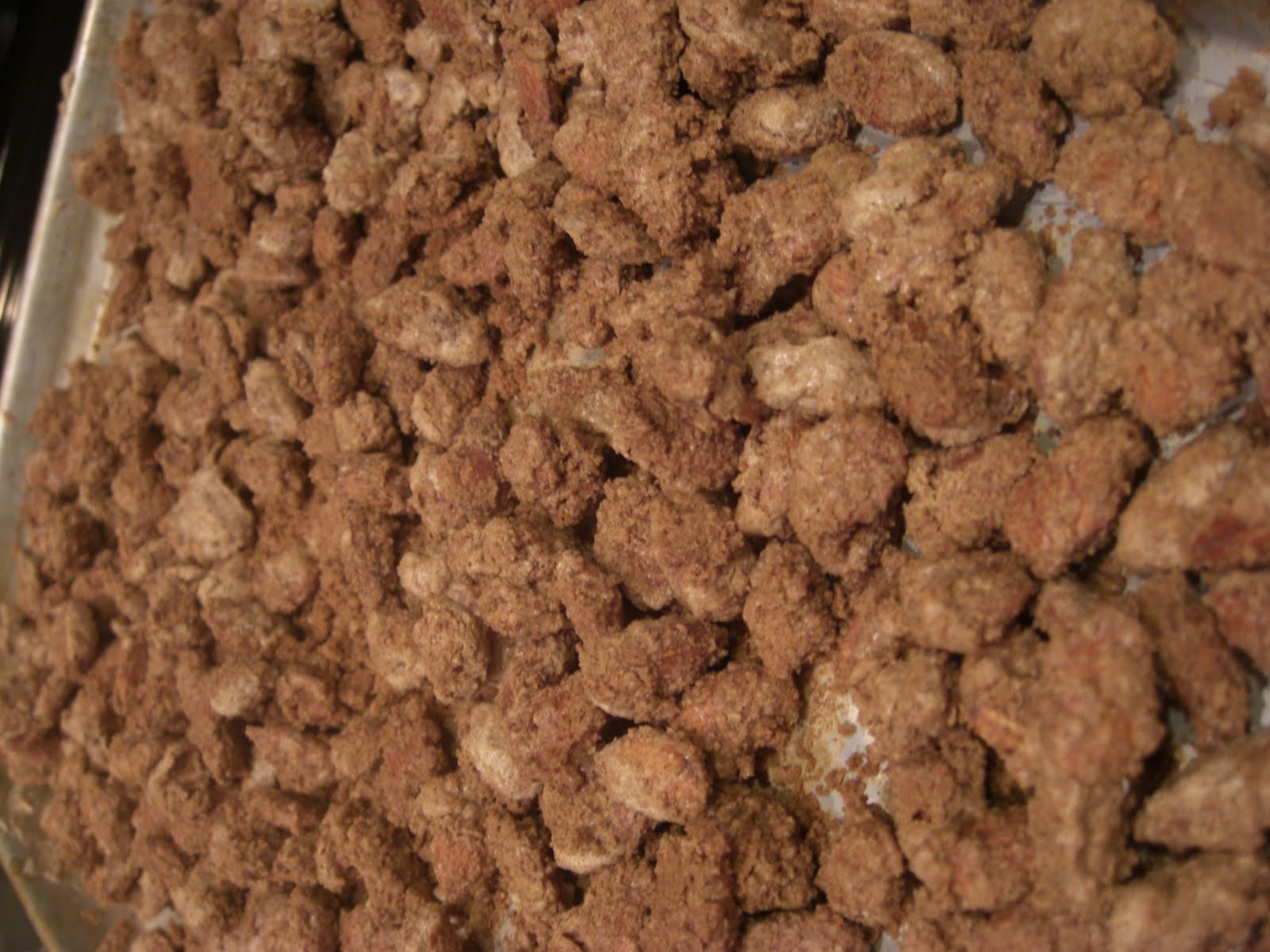 Preheat oven 250. Grease cookie sheet. Lightly beat egg white. Add water and beat until frothy but not stiff. Add almonds and stir. In a separate small bowl add sugar, salt, and cinnamon. Sprinkle over nuts. Toss and spread evenly on cookie sheet. Bake for 1 hour stirring every 15 minutes. Store in air tight container.
