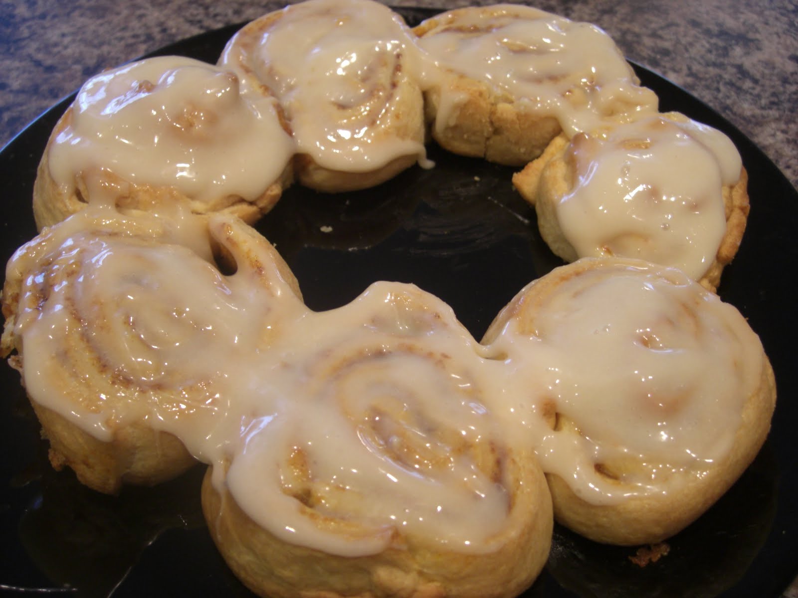 Unroll cresent rolls and pinch together to form “cinnamon roll” dough (long sides pinched together). Mix together the rest of the ingredients in a blender or with a hand mixer. Then spread over dough. Roll long end to the other long end (again, like a cinnamon roll). Cut either with a knife or using dental floss into 1/2-1 inch pieces. Place into greased 9″ round pans leaving the center open. Bake at 350 for 28-30 minutes. Cool for 10 minutes then frost.
