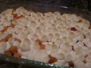 In a medium-large pot place sweet potatoes. Cover with water. Bring to a boil and cook until tender. Drain water and let potatoes cool. When cooled enough to handle remove skins. Cut into cubes. Place in pan. Add cherries and juice. Sprinkle with cinnamon. Thinly slice butter and place throughout potatoes. Bake uncovered at 350 for 20-25 minutes. Remove pan from oven, but leave oven on. Top with marshmallows. Place back in oven until mallows are golden brown.