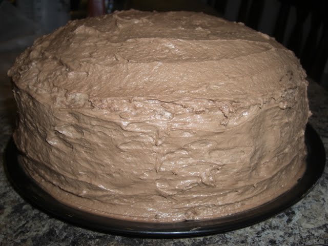 - Place one layer of cake onto a serving plate. Top with 1 1/2 cups of the mousse, then cover with the remaining cake layer. Frost with the remaining mousse, and refrigerate until serving. Garnish with fresh fruit or chocolate shavings.