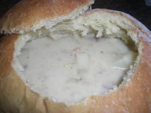 - In the bacon grease remaining in the pan, saute the celery and onion until onion begins to turn clear. Add the garlic, and continue cooking for 1 to 2 minutes. Add the cubed potatoes, and toss to coat. Saute for 3 to 4 minutes. Return the bacon to the pan, and add enough chicken stock to just cover the potatoes. Cover, and simmer until potatoes are tender.