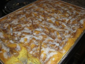 3. Place butter into a microwave safe bowl and melt, about 30-40 seconds. Add brown sugar and cinnamon to bowl, mixing until combined. Drizzle mixture evenly over cake then take a knife and run it through to swirl.