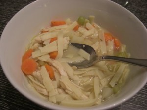 In a large sauce pan over medium heat add chicken stock, carrots, and potatoes. Cover. Meanwhile, over medium heat add olive oil, celery, and onions. Cook until transparent. Then add to chicken stock. Check on the potatoes and carrots and once they are only slightly firm (a fork will penetrate but not make it fall apart) add egg noodles, chicken, and thyme. Cook for about 7 more minutes or until egg noodles and cooked through. Serves 6+ people depending on how big your people are π