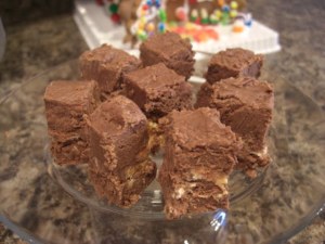 Pour half of fudge into a 9×9 foil lined pan. Sprinkle with candy bar. Pour remaining fudge over and flatten evenly. Place in fridge for faster set time. Remove the fudge, foil and all, out of pan. Cut.