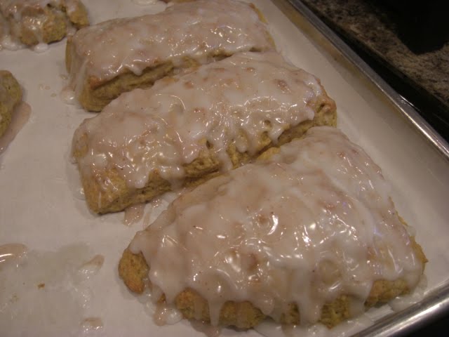 While they are baking prepare plain glaze and spiced glaze. When the scones are cooled brush plain glaze. The more the merrier in my opinion. Then drizzle spiced glaze over the top. Super yummy to eat with a tall glass of milk!